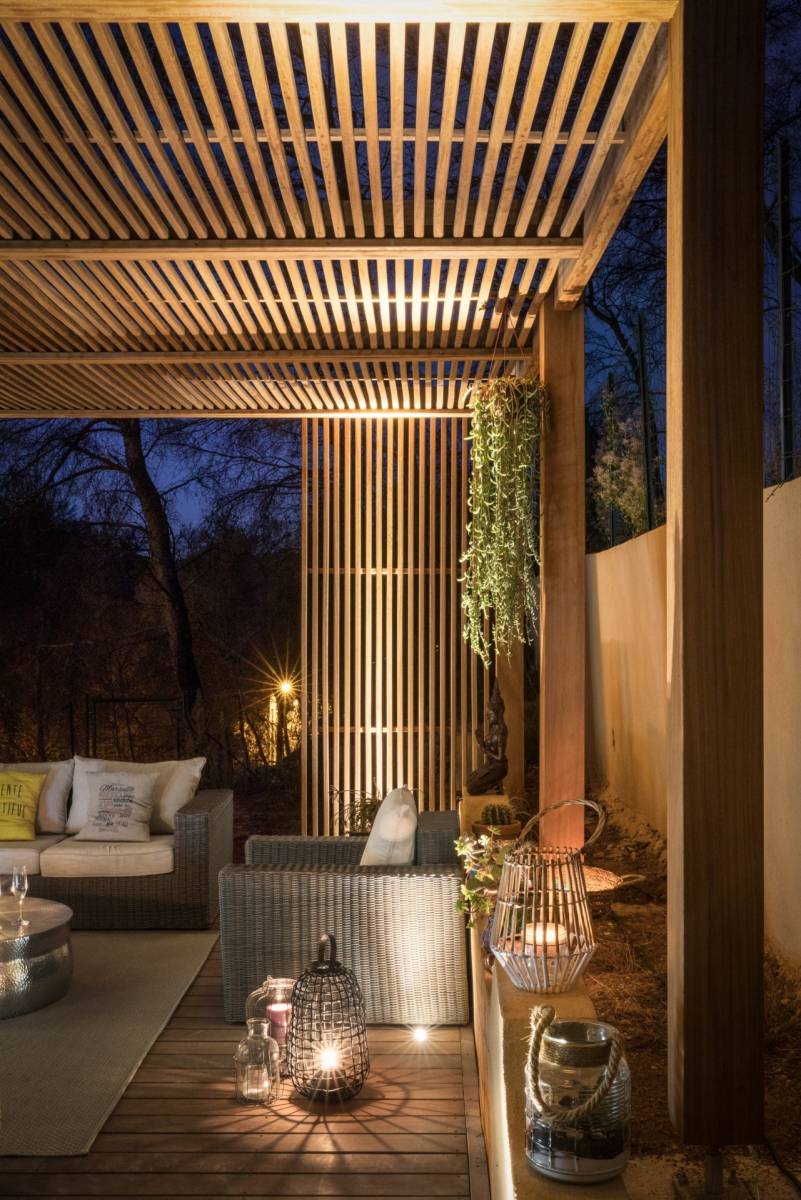 Nos pergolas adossées intègrent un système bioclimatique précis. Grâce à une étude technique en amont, nous déterminons l'angle parfait pour les lames en bois orientées fixes, optimisant l'ombre et la luminosité sur votre terrasse. Ce savoir-faire technique vous assure un espace frais en été et confortable toute l'année. Nous proposons également l'intégration d'autres éléments, tels que du mobilier sur-mesure ou des braseros, pour créer un extérieur unique et sophistiqué. Pour une projection optimale, toutes nos créations sont réalisées à partir de plans 3D.