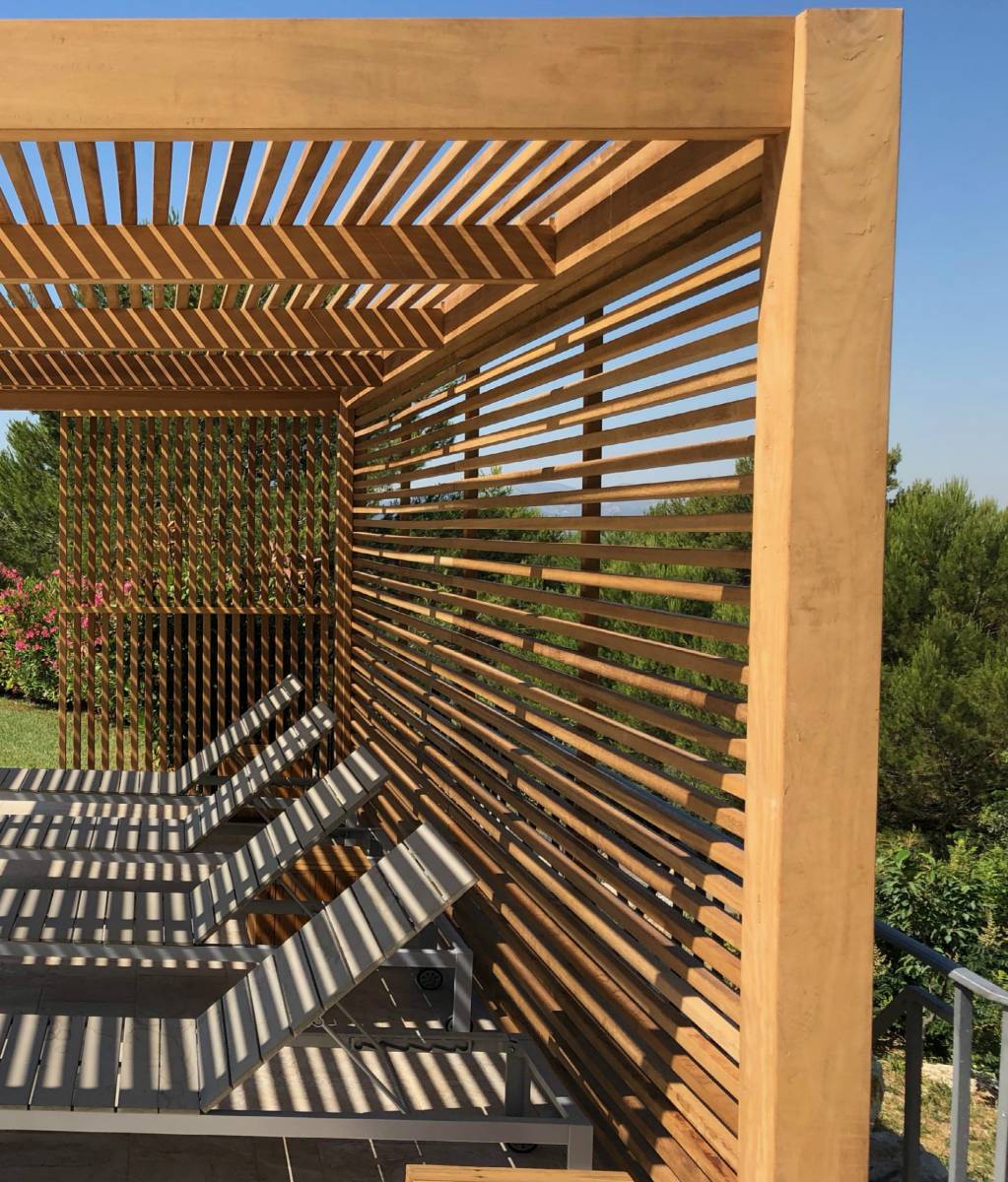 Matériaux de Qualité : Nous utilisons exclusivement du bois exotique haut de gamme (comme l'Ipé ou le Cumaru), naturellement imputrescible et très résistant aux intempéries. Ce choix garantit la longévité de votre aménagement sur Hyères et ne requiert qu'un entretien très faible.